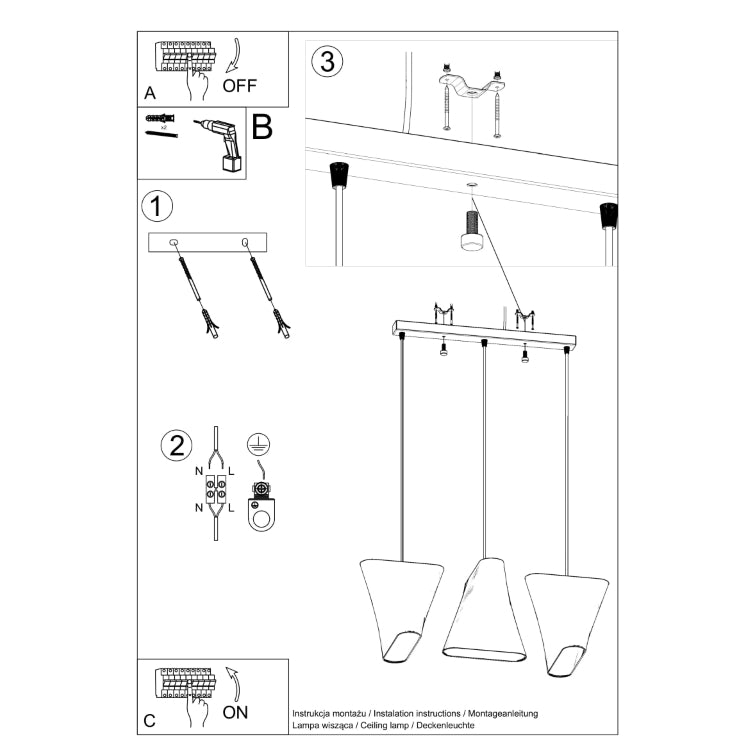 Light source: E27, 3x max 15W LED, 50Hz, ~230V, IP20, protection class I